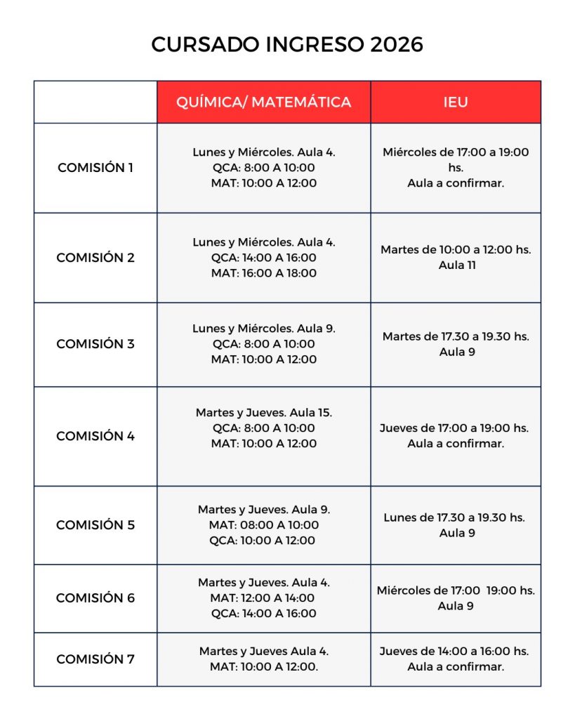 - Ingresantes de años anteriores: Viernes 27/02/2026 – 10 hs Química – 16 hs Matemática.