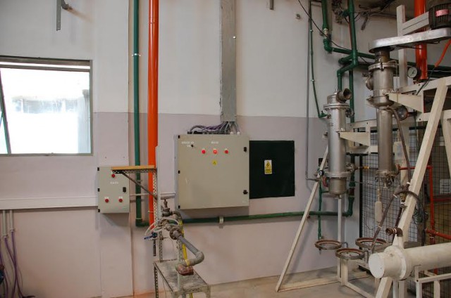 - La aislación térmica con espuma de poliuretano termo hidrófuga in situ (con un espesor de 25 mm sobre toda la cubierta de chapas interior de la planta piloto).
