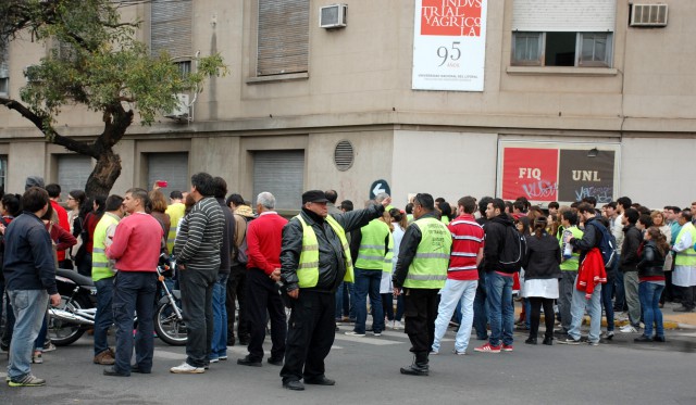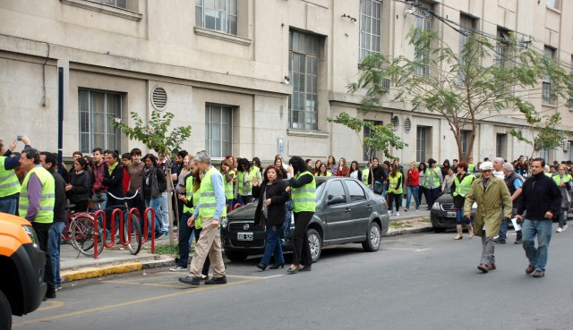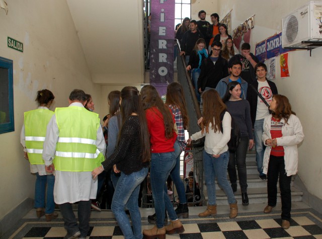 A partir de un “incendio” desarrollado en el Laboratorio de Microbiología, ubicado en el primer piso del Octógono, se activó la aplicación del protocolo establecido para los casos de emergencia. Tras la evaluación del incidente, el líder de evacuación informó la necesidad de proceder al inmediato abandono del edificio por parte de las personas que se encontraban allí y los miembros de los equipos de intervención, designados al efecto e identificados con chalecos reflectivos, se encargaron de guiar la evacuación de los sectores que tenían asignados y conducir a la gente al punto de encuentro, ubicado en la intersección de las calles Santiago del Estero y 1ro. de Mayo.