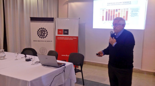 Durante la actividad, realizada en la Unión Industrial Santa Fe, se desarrollaron dos charlas: “Tecnologías para el aprovechamiento de energía solar térmica. Aplicaciones de colectores y concentradores solares”, a cargo de Enrique Albizzatti de FIQ-UNL; y “Biogás: Alternativa sustentable para generar energía eléctrica y térmica. Desarrollo de una plataforma con tecnología apropiada”, a cargo de Eduardo Gropelli de FIQ-UNL.