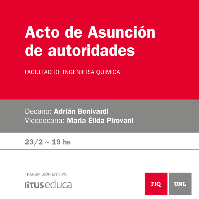 El próximo viernes 23 de febrero se realizará el acto mediante el cual asumirán el Dr. Adrian Bonivardi y la Mg. María Elida Pirovani como máximas autoridades de la Facultad de Ingeniería Química para el período 2018-2022. La actividad se llevará a cabo a partir de las 18.30 hs en el Salón de Actos Malvinas Argentinas, 3º piso de FIQ.