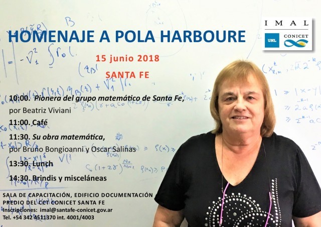 El día viernes 15 de junio, coincidente con el cumpleaños setenta de Pola, el IMAL y toda la comunidad matemática rendirán un homenaje en reconocimiento a su trayectoria científica y académica. Habrá dos conferencias que reflejarán algunos de los aspectos más destacados de la Dra. Harboure: su obra matemática y la formación del grupo de matemática de Santa Fe. Inscripciones: imal@santafe-conicet.gov.ar. Lugar: Sala de Capacitación del Edificio de Documentación, Predio CCT CONICET Santa Fe.