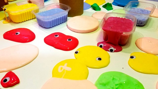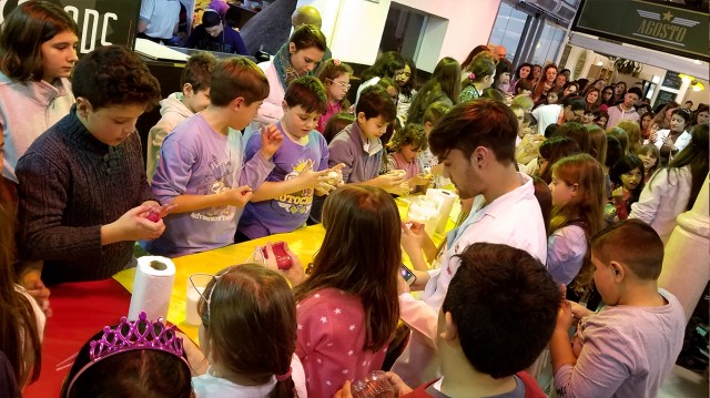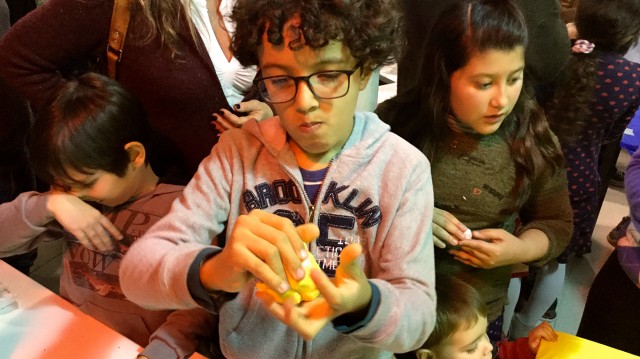 Durante la segunda jornada, el taller experimental de producción de masas tipo slime “Monstruos pegajosos” colmó cada rinconcito del Mercado con personas deseosas de aprender a producir sus propias masas. El taller articuló la narrativa y la práctica experimental recuperando aspectos disciplinares de la Química y la Física. Estuvo inspirado en cuentos infantiles sobre ‘monstruos’ y las ‘masas de colores’, y durante la actividad se explicaron cómo y por qué se forman las masas conocidas como “slime” de material polimérico. Las recetas de producción de masas fueron desarrolladas por María Eugenia Taverna, Mara Polo, Carlos Busatto, Agustín Forchetti y Victoria Hormaiztegui, del Instituto de Desarrollo Tecnológico para la Industria Química (INTEC-UNL/Conicet). Esta actividad contó también con la participación de docentes y estudiantes voluntarios que lograron realizar un taller multitudinario y desbordante de manos inquietas.
