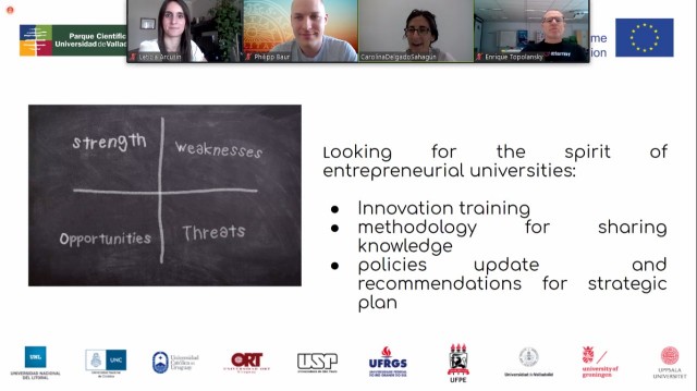 Estas reuniones tienen por objetivo avanzar en el desarrollo del último paquete de trabajo del proyecto: "Universidad Emprendedora". En estos encuentros se presentaron los resultados de los relevamientos realizados en las universidades participantes en lo que refiere a las fortalezas, oportunidades, debilidades y amenazas de cada una en relación al concepto de “Universidad Emprendedora”. Por otro lado, se trabajó en el diseño de un workshop que se realizará virtualmente los días 7 y 8 de mayo, en el que participarán actores claves de cada socio del proyecto, con el objetivo de compartir experiencias para socializar fortalezas y trabajar sobre las debilidades encontradas.