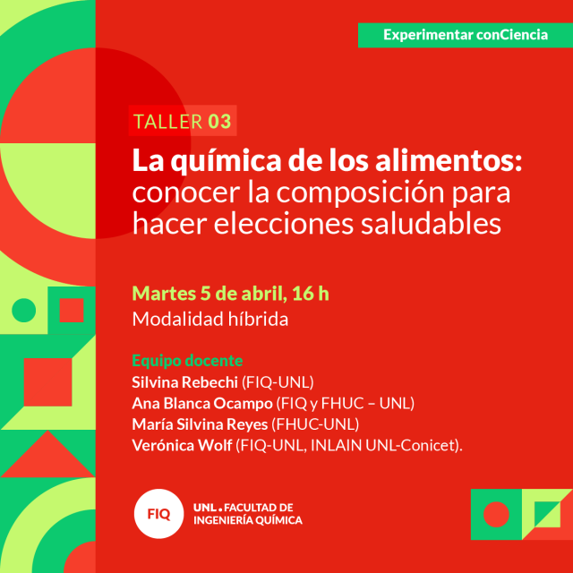 El tercer taller del ciclo tendrá lugar el martes 5 de abril a las 16hs. y se titula: La química de los alimentos: conocer la composición para hacer elecciones saludables. Se realizará en modalidad híbrida (presencial en el Aula Leloir y virtual por Plataforma Zoom).